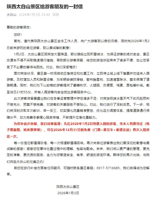 1月3日,陜西太白山景區(qū)發(fā)布給游客朋友的一封信稱(chēng),1月2日,太白山景區(qū)因突發(fā)大雪降溫,部分路段出現(xiàn)積雪結(jié)冰,為保證游客的絕對(duì)安全,景區(qū)交通車(chē)不得不采取穩(wěn)速慢行措施,導(dǎo)致部分游客滯留,對(duì)此深感愧疚。面對(duì)突發(fā)狀況,景區(qū)第一時(shí)間啟動(dòng)應(yīng)急響應(yīng)和處置工作,立即停止線(xiàn)上線(xiàn)下售票并勸返未入園游客。截至當(dāng)日21時(shí)55分,所有入園游客均安全抵達(dá)游客服務(wù)中心。凡在2026年1月2日購(gòu)票入園的游客,憑本人購(gòu)票憑證(電子票截圖、紙質(zhì)票根等),可在2026年12月31日前免費(fèi)(門(mén)票+景交車(chē)+索道往返)再次入園游覽一次。