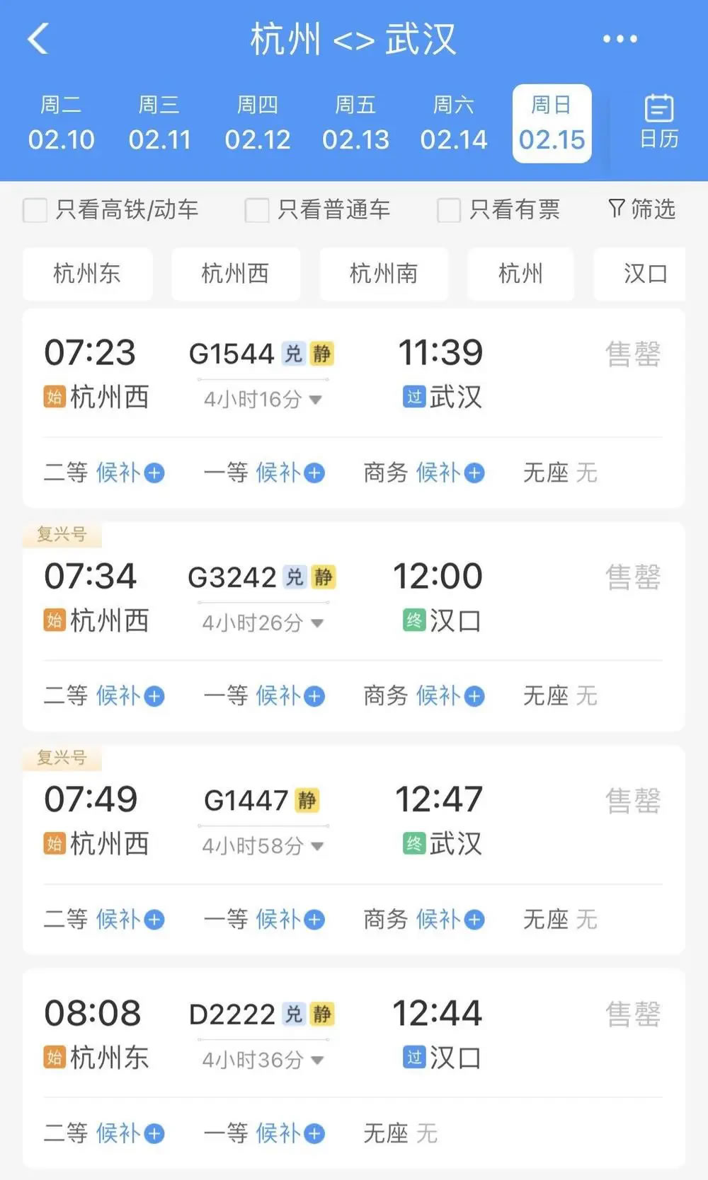 比如,2月15日杭州前往武漢、長沙、南昌、貴陽等地,無論是普速列車還是動車組列車,當(dāng)天所有車次已經(jīng)基本全部售罄,只剩極個別車次硬座、無座席位還有余票。