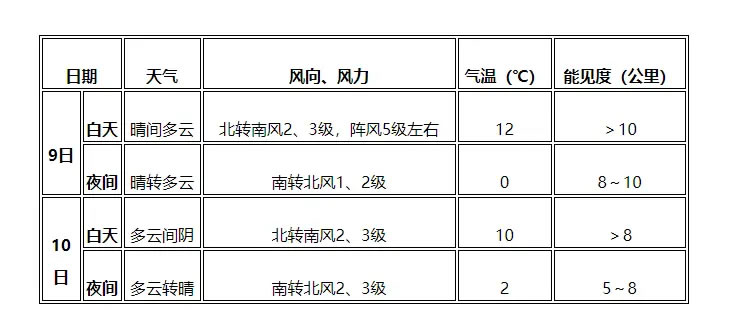 9日中午至10日中午:煙大航線天氣為陰,西北風(fēng)轉(zhuǎn)南風(fēng)5~6級(jí)。瓊州海峽天氣為多云間陰,東北風(fēng)5~6級(jí)、陣風(fēng)7級(jí)。兩岸“小三通”兩馬航線天氣為小雨轉(zhuǎn)陰,東北風(fēng)4~5級(jí)、陣風(fēng)6~7級(jí),夜晨部分時(shí)段有能見度不足10公里的輕霧,對(duì)水上航線有一定影響;廈金航線天氣為陰到多云,東北風(fēng)5~6級(jí)、陣風(fēng)7級(jí)增強(qiáng)至6~7級(jí)、陣風(fēng)8級(jí),對(duì)水上航線有一定影響。舟山水域天氣為多云,偏北風(fēng)6~7級(jí)、陣風(fēng)8級(jí),10日減弱至東北風(fēng)5~6級(jí),對(duì)水上航線有一定影響。