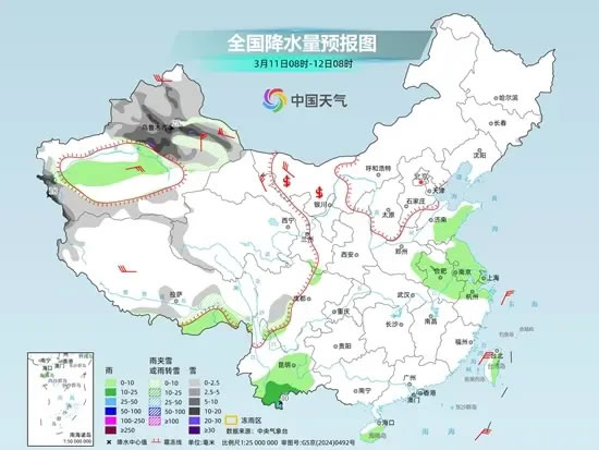 具體來看,中央氣象臺預(yù)計,今天新疆北部和南疆山區(qū)、西藏西北部和東部等地部分地區(qū)有小到中雪或雨夾雪,其中,新疆沿天山地區(qū)和南疆西部山區(qū)等地部分地區(qū)有大到暴雪,局地大暴雪。新疆南疆盆地、西藏東南部、山東中東部、蘇皖大部、浙江北部、云南中東部、海南島等地部分地區(qū)有小到中雨,其中,云南西南部等地部分地區(qū)有大雨。