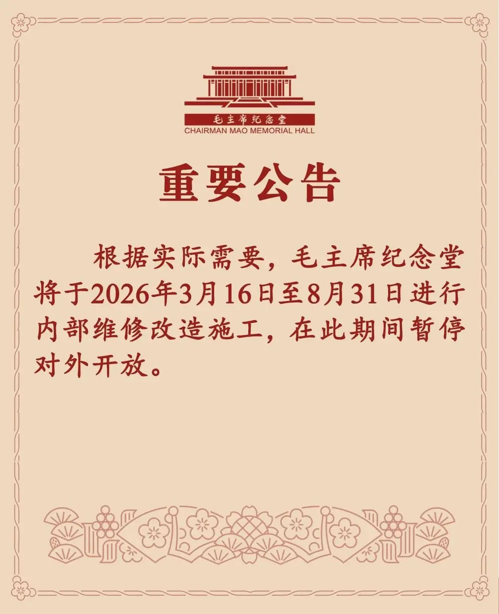 3月13日,毛主席紀(jì)念堂發(fā)布公告,3月16日至8月31日內(nèi)部維修改造施工,期間暫停對(duì)外開(kāi)放。