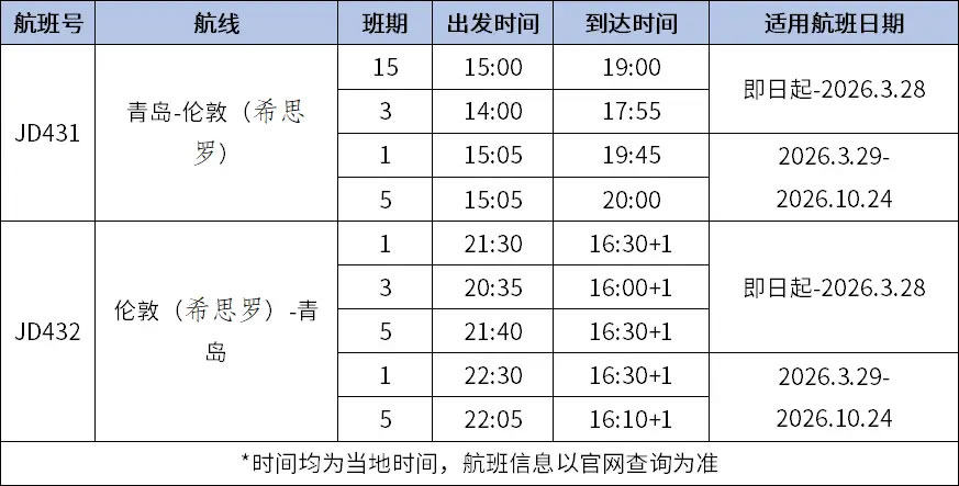 2026年夏秋航季重啟的青島往返倫敦(蓋特威克)航線,每周三固定執(zhí)飛,采用空客A330寬體機型,為英國旅客進入中國華東地區(qū)搭建直達橋梁。借助青島航空樞紐的輻射作用,該航線可聯(lián)動國內多地航線,實現(xiàn)英國旅客來華后的無縫銜接。具體航班時刻如下(均為當地時間,航班信息以官網查詢?yōu)闇剩?/p>