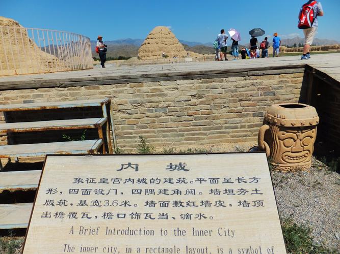 月城北側(cè)為內(nèi)城,四面環(huán)繞的補墻多已坍塌,從遺址上看近似方形,南北長190米,東西寬180米,神墻正中各有神門,南神門址高出地面半米多,寬12米,門址兩側(cè)神墻比其他地方的更寬,周圍散落著大量建筑材料,其它各門址周圍亦散見磚瓦等建筑用材。各轉(zhuǎn)角處略顯高大,可能原來建有角樓。南神門內(nèi)中軸線40米偏西約8米處有一處獻殿遺址,已清理,臺基為東西長方形,長20.2米,寬15.2米,高70厘米,臺基邊緣向上略有收分,上部為黃沙土夯筑,下部為黃沙土層與砂石層相間夯筑,南部有踏道,斜長3.5米,寬3米,臺基踏道兩側(cè),各有一列基址.地面有石像生殘塊,基址南北向,南北長10米,東西寬2.8米,兩縱側(cè)砌有長方形磚。獻殿清理出的堆積物主要有:長方磚、方形磚和板瓦、筒瓦、灰槽瓦及瓦當(dāng)、滴水等遺物殘塊,以筒瓦最多。距獻殿約5米處為墓道封土,呈東南-西北走向,但方向擺動不大。寬6至10米,西北端高大,整個墓道封土高度介于0.5至2米之間,形似魚脊,主要為砂石土。北端靠近陵臺有一半圓形盜坑,直徑約6米,深約5米,破壞了陵臺南部底邊。內(nèi)城西北處有一陵臺,四面坍塌嚴(yán)重,殘高約為10米,黃土夯筑,各層夯土之間夾有幾層石塊,椽洞分布不勻,夯層的厚度在8至13厘米不等。西側(cè)清理的堆積中有磚瓦等建筑用材。從盜坑斷面來看,陵臺似乎是平地起建的,沒有打地基陵臺底部的外表覆蓋有紅泥皮。位于內(nèi)城墻外約5米處為外神墻遺址,墻基寬1.7米,沿墻基準(zhǔn)礫石,最終連通至內(nèi)城南墻。外神墻到達東、西、北三神門處,皆向外凸出一個長方形空間,長17米左右,寬12米左右,空地內(nèi)地面平整,沒有其它遺跡現(xiàn)象。外神墻外有4座角臺遺址,已經(jīng)全部坍塌,北面兩座角臺基址相距340米,南面兩座角臺相距365米。東南角臺還殘存大約4.5米的部分,方形夯土臺邊長4.5米,夯土中央有石塊,周圍散落部分建筑材料,其余三座角臺殘存均不超過1.5米。