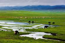 祁連山草原因交融之美,被評為“中國最美的六大草原”之一,具有面積大、草質(zhì)好、類型多、產(chǎn)草量高等特點(diǎn),有罕見的林中草場。海拔4000以上還有高山積雪形成的碩長而寬闊的冰川地貌奇麗壯觀。進(jìn)入祁連境內(nèi),放眼望去,滿目盡是草原旖旎的風(fēng)光。夏季的草原像是廣袤無垠的綠毯,滿山的白藏羊恰似散落的珍珠,黑色的牛毛帳篷、裊裊升起的炊煙、牧人悠揚(yáng)的歌聲,這一幕如畫風(fēng)景卻是草原最尋常的景色。