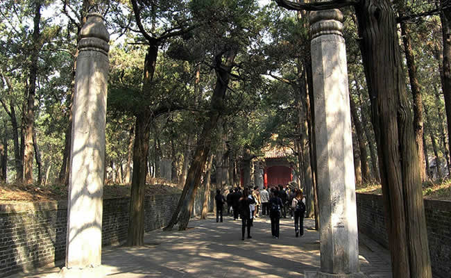 孔林本稱至圣林,是孔子及其家族的墓地。 孔子死后,弟子們把他葬于魯城北泗水之上,那時還是“墓而不墳”(無高土 隆起)。到了秦漢時期,雖將墳高筑,但仍只有少量的墓地和幾家守林人后來隨著孔子地位的日益提高,孔林的規(guī)模越來越大。東漢桓帝永壽三年(公元157年),魯相韓勅修孔墓,在墓前造神門
