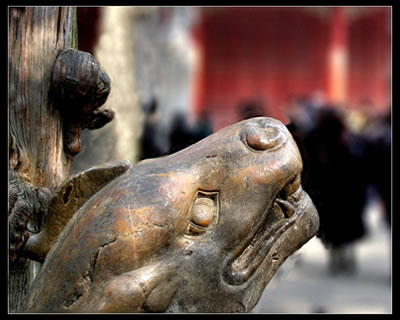 北出曲阜城門,就見兩行倉檜翠柏,如龍如虬,夾道而立,這就是孔林神道。道中巍然屹立著一座萬古長春坊。這是一座六楹精雕的石坊,其支撐的6根石柱上,兩面蹲踞著12個神態(tài)不同的石獅子。坊中的“萬古長春”四字,為明萬歷二十二年(公元1594年)初建時所刻,清雍正年間卻又在坊上刻了“清雍正十年七月奉敕重修”的字樣。石坊上雕有盤龍、舞鳳、麒麟、駿馬、斑鹿、團花、祥云等,中雕二龍戲珠,旁陪丹鳳朝陽紋飾,整個石坊氣勢宏偉,造型優(yōu)美。