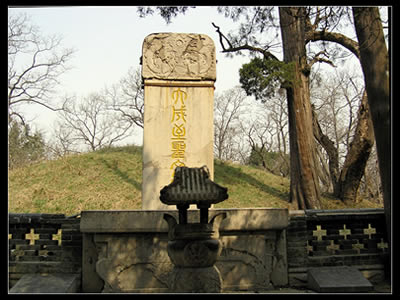 享殿之后是孔林的中心所在--孔子墓。此墓似一隆起的馬背,稱馬鬣封。墓周環(huán)以紅色垣墻,周長里許。墓前有巨墓篆刻“大成至圣文宣王墓”,是明正統(tǒng)八年(公元1443年)黃養(yǎng)正書。墓前的石臺,初為漢修,唐時改為泰山運來的封禪石筑砌,清
