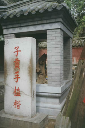 孔子墓西的3間西屋為子貢廬墓處?鬃铀篮,眾弟子守墓3年,相訣而去,獨子貢在此又守3年。后人為紀念此事,建屋3間,立碑一座,題為“子貢廬墓處!毕淼钪螅碛幸蛔彝邤尖頂?shù)姆酵,稱“楷亭”。亭內(nèi)石碑上刻著一棵古老的楷樹,即摹自其南側(cè)的“子貢手植楷”。相傳子貢奔喪來后,將一棵楷樹苗栽于其師墓旁,后成大樹。清康熙間遭雷火焚死,后人將枯干圖象刻于石上。