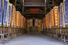 忠義堂院落里,中央是一根朱紅色的旗桿,上面懸掛著一面杏黃旗,-“替天行道”四個黑色大字。忠義堂前的平臺兩側(cè),又有兩桿粉色的大旗,東面的旗幟上是“山東呼保義”,西邊懸掛的是“河北玉麒麟”。