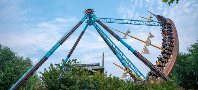 隨著美人魚大炮怒吼,沉睡的海底遺跡、兇猛的海洋生物讓開了航,15米高18海里/小時(shí)航速,60度擺角,海盜船繞水平軸由緩至急、往復(fù)擺動(dòng),時(shí)而沖上駭浪、時(shí)而跌入驚濤,帶您體驗(yàn)無(wú)拘無(wú)束而精彩刺激的冒險(xiǎn)旅行,讓您領(lǐng)略絢麗迷人而傳奇神秘的海盜生活:骷髏、獨(dú)眼、木腿、鐵鉤、鸚鵡、金銀島、藏寶圖……圣·克斯基號(hào)船長(zhǎng)來(lái)了!