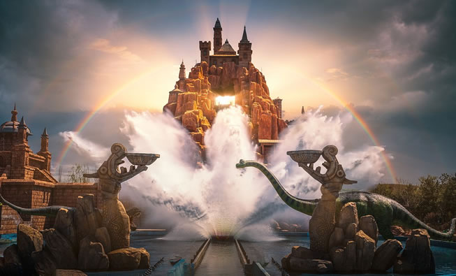 逃出恐龍島是以吳哥窟為主要建筑風(fēng)格的大型室內(nèi)漂流歷險(xiǎn)主題項(xiàng)目,游客將乘坐小車進(jìn)入危險(xiǎn)的侏羅紀(jì)時(shí)代,在茂密的叢林里展開一場(chǎng)驚心動(dòng)魄的冒險(xiǎn)。巨型恐龍的隆隆腳步震動(dòng)著大地、頭頂上盤旋著空中獵手、巨石突然從眼前滾落,緊張和恐怖彌漫四周。隨后游船從幾十米高的懸崖瀑布上急速下墜,讓游客在驚叫聲中經(jīng)歷一場(chǎng)永生難忘的恐龍島冒險(xiǎn)之旅。