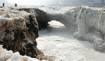 隆冬季節(jié),壺口一帶黃河水面封凍,有的地段冰層較厚,形成聯(lián)接兩岸的天然橋梁,稱(chēng)黃河冰橋。