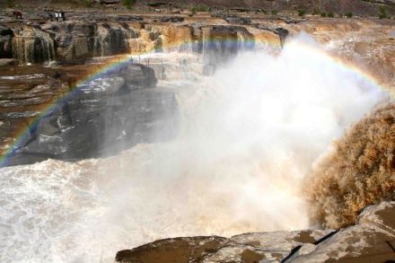 壺口瀑布反復(fù)沖擊所形成的水霧,升騰空中,使陽(yáng)光發(fā)生折射而形成彩虹。彩虹有時(shí)呈弧形從天際插入水中,似長(zhǎng)龍吸水;有時(shí)呈通直的彩帶橫在水面,象彩橋飛架,有時(shí)在濃煙騰霧中出現(xiàn)花團(tuán)錦簇,五光十色,飄忽不定,撲朔迷離,為天下奇觀(guān)。