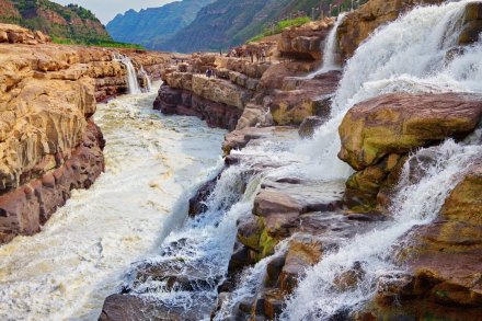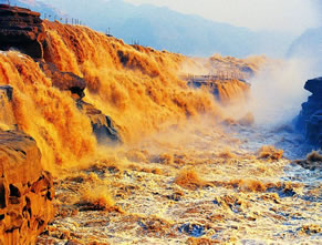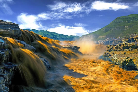 在高處河岸上,幾乎是看不到“龍槽”和黃河水流,只能看到紫褐色基巖河床中一線(xiàn)急騰翻卷的黃濁水塵和聽(tīng)到轟鳴不息的奔騰濤聲。這槽中激流就象一鍋滾沸的水,左奔右?jiàn)Z,奔騰翻滾急下,激起的水霧彌漫在龍槽之上,使黃河在這里變得朦朦朧朧。每逢汛期黃河水漲時(shí),洪水溢出壺口龍槽一端,龍槽東岸會(huì)出現(xiàn)一道一、二千米長(zhǎng)的漫流水簾,十分壯觀(guān)。遠(yuǎn)望龍槽,彎彎曲曲的峽中石槽,活象一條搖頭擺尾的巨龍,壺口是龍頭,一口吞沒(méi)黃河巨流。孟門(mén)是龍尾,腹泄河水于下游。