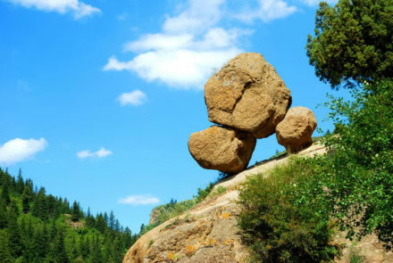 寧武縣城30公里處的東寨鎮(zhèn)西樓子山南麓半坡,有一座峭巖矗立于溝側溪畔。這峭巖高約兩丈余,頂部巍巍托起一塊巨大奇石。這奇石以兩塊小石作支腳,立于約三四十度的峭巖斜坡頂部。奇石高約3米,闊約2米。雖立斜坡,風吹似動,但數(shù)干百年來,它卻一直屹立在那里。由于奇石狀似加蓋的鍋,支撐它的兩小石形若鍋腳,故而人稱“支鍋奇石”,成為古寧武府和寧武縣八大奇景之一。據(jù)關專家考察,該奇石形成于第四紀冰川期。