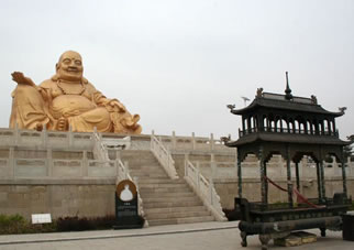 彌勒大佛臺位于九峰塔以南1000米處的龜背山頂。烏金山彌勒大佛由漢白玉雕琢而成,高9.9 米。彌勒大佛臺基座為三層,高5米。第三層為須彌座,前面浮雕為二十諸仙圖,西面為十八羅漢,東面為十二圓覺,北面為十大明王,四角為四大金剛。從地面到佛頂共高14.9米。