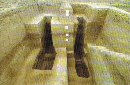 墓地東、西、北部均有圍溝環(huán)繞,形成長321、寬273米南部敞開的南北向長方形墓園。墓葬群位于墓園正中偏北,墓地中軸延長線正南500米處為呂氏家廟“呂氏莊閣云寺”故址。墓葬排列脈絡(luò)清晰,中軸線上自南向北縱向貫魚式為長子長孫系列,橫向則按輩份分排布置。墓地使用時間為宋神宗熙寧七年(公元1074年)至徽宗政和元年(公元1111年),共計埋葬五代呂氏族人。