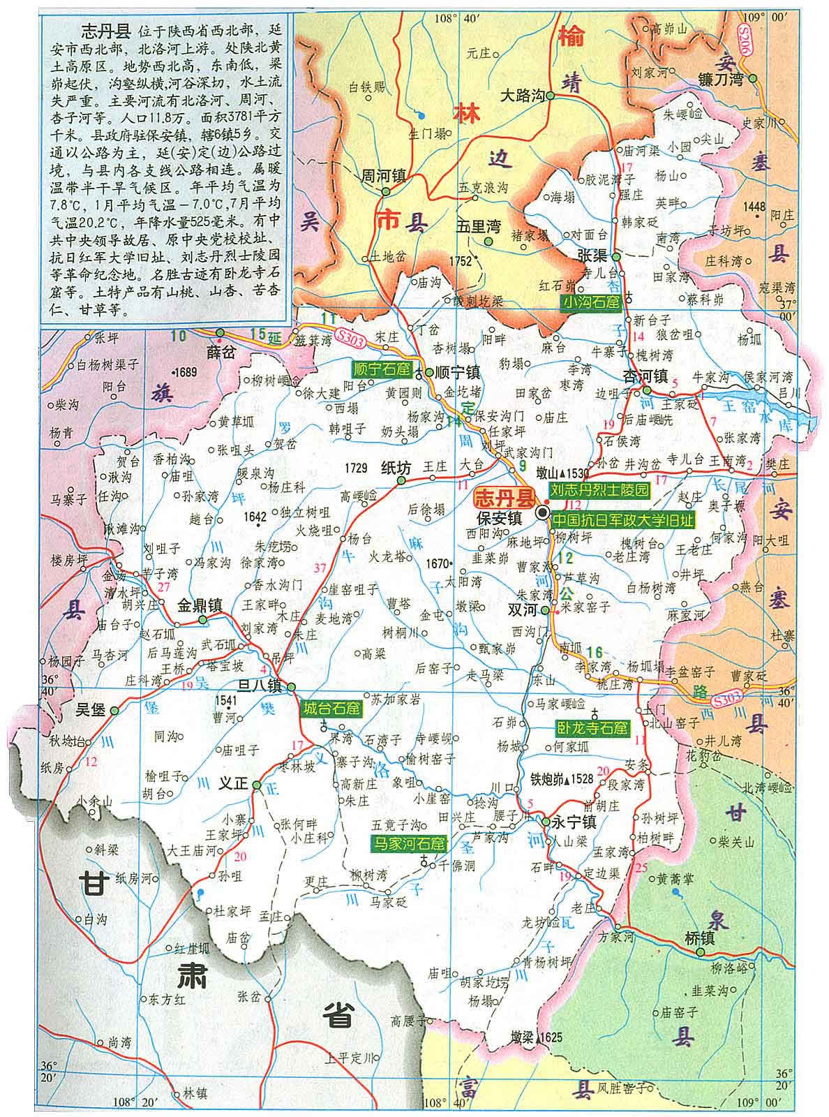 志丹縣位于延安市西北部,是“群眾領袖、民族英雄”劉志丹將軍的故鄉(xiāng),被譽為中國革命的“紅都”。全縣總土地面積3781平方公里,轄6鎮(zhèn)5鄉(xiāng)土91個行政村。全縣總人口13.4萬人,其中農(nóng)業(yè)人口10.6萬人,人口密度為35.4人/平方公里。全縣平均海拔1093-1741米,年平均氣溫7.8℃,年平均降水520毫米,多集中在7、8、9三個月,無霜期142天。