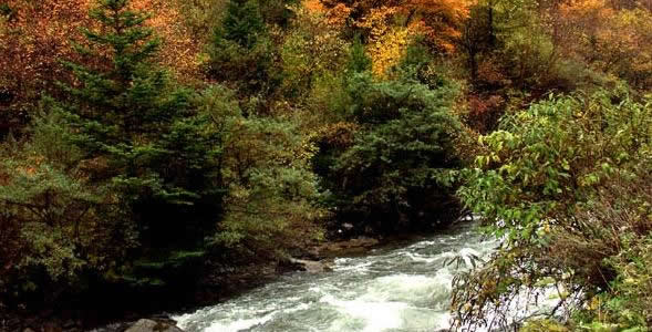 奶子溝:在藏語中是美麗富饒、幸福安寧之意。奶子溝八十里彩林風(fēng)情谷因身處深谷獨(dú)享清幽雅靜的奶子溝而得名,又以美甲天下的彩林世界而聞名。這里植被豐茂,陽光燦爛,氧氣充足,是個(gè)天然的大“氧吧”。奶子溝彩林洋洋灑灑長達(dá)八十里,蔚為壯觀。樹種主要由樺樹、松樹、柏樹、楓樹和各種喬木組成,還有不同色彩的針葉林、闊葉林、次生林、灌木叢點(diǎn)綴其間,密密麻麻地覆蓋了一坡又一坡。在純凈的藍(lán)天底下,紫紅、粉紅、橘紅、金紅、深黃、草綠、黃綠、棕紅、褐色的樹木形成了“萬類霜天競自由”之勢。進(jìn)入彩林世界你會感覺進(jìn)了油彩的世界,任你語言學(xué)家、色彩學(xué)家在它面前都會感到詞匯的匱乏,色彩的蒼白。