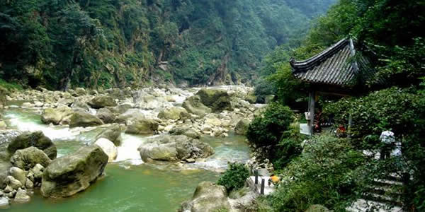 九龍溝:位于崇州市西北三郎鎮(zhèn),因“九溝九槽九條龍”的神話傳說(shuō)而得名。這一地區(qū)為龍門(mén)山脈口段前斷裂帶,地質(zhì)構(gòu)造復(fù)雜,群山在海拔700米到3868米之間起伏變化,相對(duì)高差懸殊較大,懸崖陡峭,多飛瀑迭湍、深溝狹谷,有眾多的酷似龍形的奇峰怪石和飛瀑流泉。九龍溝內(nèi)水石相擊之聲如龍吟似龍嘯,巨石躺臥之狀如龍盤(pán)似龍睡,山峰聳立之形如龍騰似龍臥,簡(jiǎn)直就是活生生的“人間龍宮”。崇州百姓中流傳有“九條龍從九龍池出游,在九龍山會(huì)合,回九龍溝安家,并在龍?zhí)蚴狭粝戮艤暇挪劬艞l龍”的神奇?zhèn)髡f(shuō)。九龍溝景區(qū)面積175平方公里,其中游覽面積32平方公里,由九龍溝水石景區(qū)、大西山原始森林景區(qū)和古寺等三部分組成,以九龍溝動(dòng)態(tài)水石景觀最引人入勝,是風(fēng)景區(qū)的主要部分,有化石巖、珍珠泉龍石巖、龍女浣紗池、龍?zhí)蚴、鉆天峰、響水溝、九龍飛瀑等景觀,其中龍女融積雪而成的“九龍飛瀑”,寬10余米,高100余米,是成都地區(qū)不可多見(jiàn)的大瀑布。密林中隱藏著雄偉的古剎,是成都地區(qū)山林中保存較完好的規(guī)模較大的古廟。