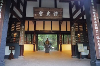 詩史堂是中軸線上的第三重建筑,也是主體建筑。杜甫留下的1400多首詩歌,真實(shí)而生動(dòng)地展現(xiàn)了“安史之亂”前后唐代社會生活畫卷,反映了唐朝由盛轉(zhuǎn)衰的歷史。杜甫被后世尊為“詩圣”,他的詩歌被稱為“詩史”, “詩史堂”也因此得名。大廳的正中陳列著一尊由我國著名雕塑家劉開渠先生以寫實(shí)的手法來刻畫的杜甫塑像。