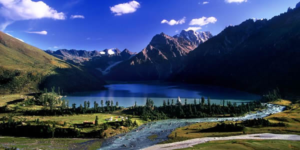 雀兒山屬沙魯里山脈北段,地勢(shì)呈西北——東南走向,是典型的冰川地貌,海拔5000米以上的山峰有30座,最高峰絨麥俄扎,海拔6168米,終年積雪不化,是四川省第四高峰。雀兒山下的新路海風(fēng)景區(qū)在川藏公路之側(cè),距德格縣城100公里,海拔4040米。新路海平均深度10米,最深處15米,是甘孜州著名的冰蝕湖。水源由雀兒山冰川和積雪消融供給,湖尾流出的溪流為措曲河源頭之一。新路海藏語(yǔ)各玉龍拉措,意為“傾心之湖”,相傳格薩爾王傳的愛(ài)妃珠牡來(lái)到湖邊,被秀麗的湖光山色和幽靜的環(huán)境所吸引,緋徊湖邊留連忘返。后人為了紀(jì)念珠牡,取名“玉龍拉錯(cuò)”。玉龍拉錯(cuò)及周圍生態(tài)原始、完整、晶瑩的冰川從海拔五千米的粒雪直瀉湖濱草原,極為壯觀。湖泊周圍由高原云杉、冷杉、柏樹(shù)、杜鵑樹(shù)和草甸環(huán)繞。藍(lán)天白云,雪峰皚皚,冰川閃爍,青山融融,綠草茵茵,波光粼粼。湖岸珍禽異獸出沒(méi),湖中野鴨成群,魚(yú)兒游弋,夏秋季節(jié),山花爛熳,爭(zhēng)芳斗艷,真可謂世間仙境。