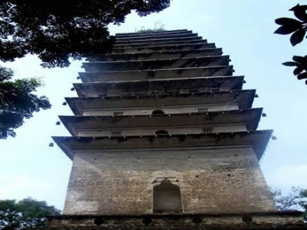 靈寶塔又名凌云塔,因其聳立在凌云寺后的靈寶峰巔,故以山峰命名。塔建于唐代,塔形呈密檐式四方錐體,磚砌而成,坐東向西,高38米,共十三級。塔體中空,內(nèi)確 ”石階沿塔軸盤旋至頂。塔頂為四角攢尖式。靈寶塔的結(jié)構(gòu)和風(fēng)格與西安小雁塔相似。