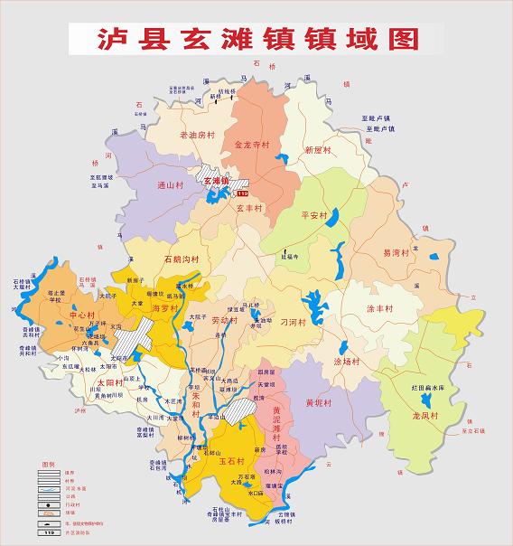 瀘縣玄灘鎮(zhèn)鎮(zhèn)域圖 行政區(qū)劃 瀘縣玄灘鎮(zhèn)幅員面積115平方公里,轄區(qū)內(nèi)人口9萬人,城鎮(zhèn)建成區(qū)面積2平方公里,常住人口2.2萬人。轄5個社區(qū)、20個行政村《正大街社區(qū)、東街社區(qū)、西街社區(qū)、中和社區(qū)、喻坪社區(qū) 》、《石鵝溝村、金龍寺村老油房村、通山村、石鵝溝村、玄豐村、新屋村、平安村、刁河村、黃坭村、涂場村、龍鳳村、涂豐村、易灣村 、太陽村、中心村、海羅村、玉石村、黃泥灘村、勞動村、朱和村》! 歷史沿革 1934年設(shè)玄灘鎮(zhèn),1937年改鄉(xiāng),1951年復(fù)建鎮(zhèn),1958年改公社,1992年再復(fù)鎮(zhèn)。1997年,面積74平方千米,人口5.6萬,轄龍鳳、飛躍、永紅、涂鋒、刁河、馮光、黃泥、同豐、黃林、新山、平安、光前、紅星、向灣、易灣、斷石龍、新屋、蔣灣、金龍寺、新房子、玄鋒、高場、陳家咀、石鵝溝、通山、萬居所、桑壩、東風(fēng)、宋糟坊、瓦子壩、清油坊31個行政村和正大街、馬路街、半邊街、鹽聯(lián)街4個居委會。 2004年,面積78平方千米,轄31個村、4個社區(qū),總?cè)丝?7621人。集鎮(zhèn)建成區(qū)面積1.7平方千米,常住人口2.15萬人。 2006年,將原玉河鎮(zhèn)所屬行政區(qū)域并入玄灘鎮(zhèn)。玄灘鎮(zhèn)政府駐玄灘場。