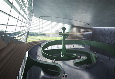 三星堆新館還包含地下一層。觀眾通過螺旋樓梯進入負一樓以后,這里設計了游玩兒童樂園和學術報告廳。未來,孩子們可以在這里通過游戲的方式愛上考古和文物,觀眾也可以在這里聆聽到考古大咖們的學術報告。