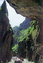 天池石門:景名為“石門一線”,海拔1500米,位于大天池以北5.9公里處,為一段被三工河古河道切割形成的石峽谷,這道山口是進(jìn)入風(fēng)景區(qū)的天然門戶;峽谷長約百余米,最窄處僅十來米寬,兩側(cè)直立的巖壁高逾數(shù)十米,形勢峻險(xiǎn),仰視見一線天,側(cè)邊盤繞三工河水。