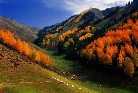 孜沿氈溝和馬鹿溝:溝谷內(nèi)谷深流急,濤聲隆隆,河水清涼純凈,河岸時(shí)而危巖矗立,時(shí)而寬闊平坦。溝谷內(nèi)植物依高矮不同分成5層,最高一層是云杉的圓錐形樹冠層,第2層是天山花楸,第3層是薔薇、忍冬、紅果小蘗,第4層是羽衣草、早熟禾、鹿蹄草、唐松草、天山鳶尾、高山羊角芹等200多種草本植物層,第5層是苔蘚、地衣。它們或相互依存,或獨(dú)在一方,把中山峽谷裝點(diǎn)得千種姿態(tài)、萬種風(fēng)情。溝谷內(nèi)野生動物種類繁多,獸類有馬鹿、狍子、野豬、棕熊、狐貍、猞猁、石貂、艾虎、野兔等,鳥類有石雞、斑翅山鶉、黑鸛、柳鶯、星鴉、金額熊雀、紅額金翅雀、朱雀、鳶尾等。