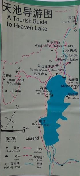 從鱷魚壩上南望博格達(dá)峰,這是天池八景的最后一景“南山望雪”,另外七景依次是以上提及的“石門一線”、“龍?zhí)侗淘隆、“懸泉飛瀑”、“定海神針”、“西山觀松”、“頂天三石”和“海峰晨曦”,以上有關(guān)此八景的《天池八景詩》由當(dāng)代詩人謝玉康所作。從鱷魚壩可擺渡到天池南岸,到南岸后繼續(xù)向南行。