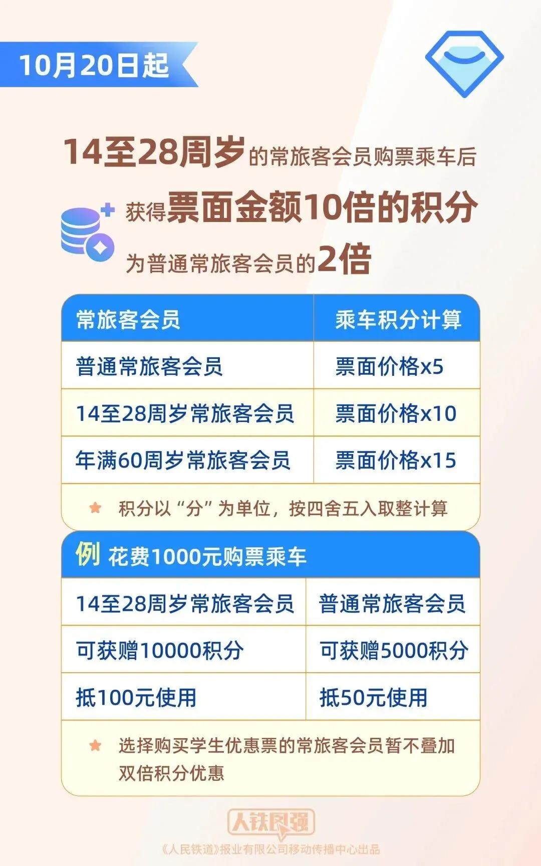 10月20日起,14至28周歲的常旅客會員購票乘車后將獲得票面金額10倍的積分,為普通常旅客會員的兩倍,即普通常旅客會員花費1000元購票乘車,可獲贈5000積分、抵50元使用;