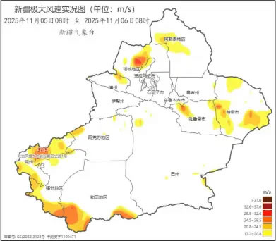 2025年11月5日08時至6日08時新疆大風實況圖 (央廣網(wǎng)發(fā) 新疆氣象局供圖)