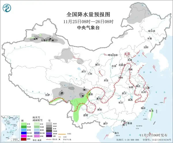 中國天氣網(wǎng)訊 進(jìn)入11月下旬,影響我國的冷空氣較為頻繁。目前,一股較強(qiáng)冷空氣正自西向東影響我國,今明天(11月24日至25日),冷空氣繼續(xù)東移南下,東北、華北東部到華南等地都將出現(xiàn)降溫。緊接著,25日至27日,又將有新一股冷空氣影響我國。此外,我國西南地區(qū)、東北等地雨雪天氣頻繁,局地或現(xiàn)大雪。