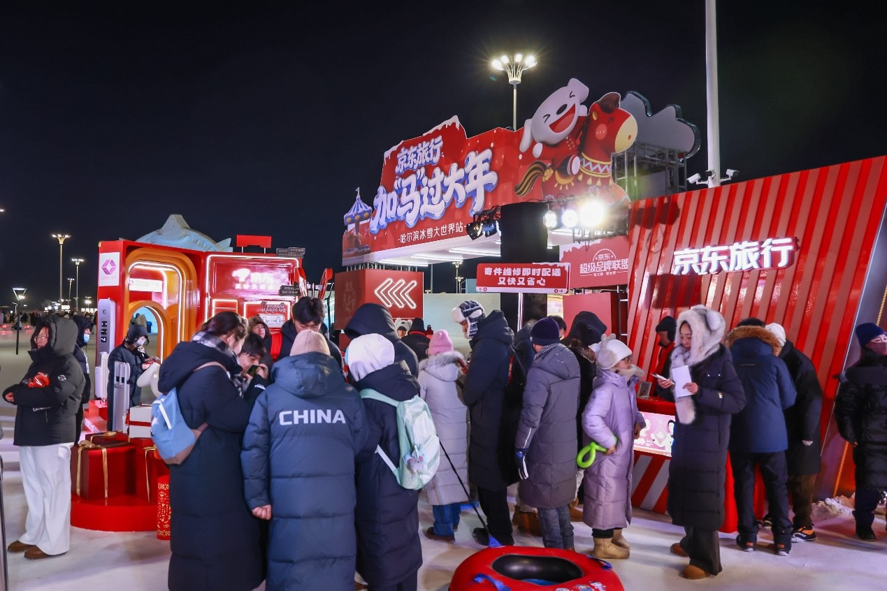 京東旅行在此次年貨節(jié)中深度融合兩大頂流文旅場景,實現(xiàn)線下事件與品牌傳播的雙重引爆。在哈爾濱冰雪大世界,京東旅行攜手京東箱包、京東健康、超級品牌聯(lián)盟、旅安、歐舒丹等品類品牌,依托其冬季頂流景區(qū)的話題熱度,通過多維互動營銷方式打造沉浸式跨界體驗:不僅設(shè)置“冰雪年貨快閃活動”開展品牌展示與互動游戲,更通過地標(biāo)冰雪摩天輪、無人機表演、冰雪大舞臺廣告/立體字/主持人口播、區(qū)域植入品牌立體廣告等豐富營銷形式,共同實現(xiàn)品牌與景區(qū)流量的深度共振。