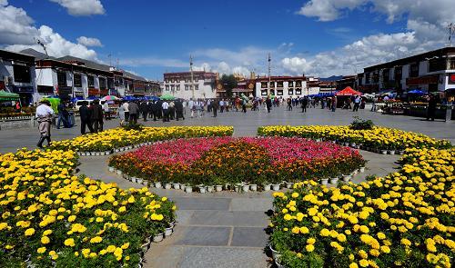大昭寺已有1300多年的歷史,在藏傳佛教中擁有至高無上的地位。大昭寺是西藏現(xiàn)存最輝煌的吐蕃時期的建筑,也是西藏最早的土木結(jié)構(gòu)建筑,并且開創(chuàng)了藏式平川式的寺廟市局規(guī)式。環(huán)大昭寺內(nèi)中心的釋迦牟尼佛殿一圈稱為“囊廓”,環(huán)大昭寺外墻一圈稱為“八廓”,大昭寺外輻射出的街道叫“八廓街”即八角街。以大昭寺為中心,將布達拉宮、藥王山、小昭寺包括進來的一大圈稱為“林廓”。這從內(nèi)到外的三個環(huán)型,便是藏民們行轉(zhuǎn)經(jīng)儀式的路線。