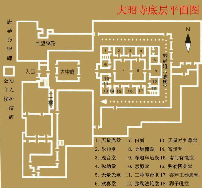 從大昭寺金頂可以看到大昭寺廣場,右邊遠處山上是布達拉宮,近處的柳樹是“公主柳”,相傳是文成公主所栽。大昭寺的布局方位與漢地佛教的寺院不同,其主殿是坐東面西的。主殿高四層,兩側(cè)列有配殿,布局結(jié)構(gòu)上再現(xiàn)了佛教中曼陀羅壇城的宇宙理想模式。寺院內(nèi)的佛殿主要有釋迦牟尼殿、宗喀巴大師殿、松贊干布殿、班旦拉姆殿(格魯派的護法神)、神羊熱姆杰姆殿、藏王殿等等。寺內(nèi)擁有各種木雕、壁畫。