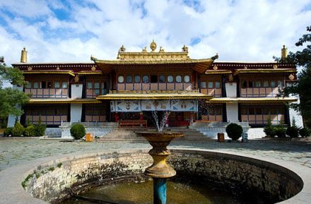 宮殿共三層,一層是經(jīng)堂,前面有一個(gè)600平方米的石板院子,二層有羅漢殿,護(hù)法殿和達(dá)賴閱經(jīng)室,三層是達(dá)賴接見(jiàn)僧俗官員的地方。園中樹(shù)木茂盛,花卉繁多,更有亭臺(tái)池榭,林竹山石,珍禽異獸等,宮前長(zhǎng)廊和室內(nèi)雕梁畫(huà)棟。