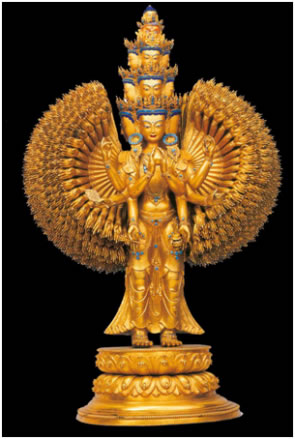 西藏本土制造的宗教文物,以金銅造像最著名。羅布林卡興建之初,七世達(dá)賴為給剛建好的宮殿佛堂添裝佛像及佛教用具,曾在布達(dá)拉宮腳下建立了一所名為“雪堆白”的造像場(chǎng),匯集了藏區(qū)內(nèi)幾百名能工巧匠,在這里精心打造各種佛像器物,以滿足拉薩及周邊地區(qū)寺院的需求。羅布林卡從初建到最后完善,每座佛堂里的大小佛像都被指定由“雪堆白”工匠量身定做打造。除此之外,園內(nèi)很多佛龕、宗教用具、金頂屋檐、門楣雕飾等,也都出自“雪堆白”工匠之手!把┒寻住痹煜裉攸c(diǎn)是制作精細(xì)、比例勻稱、色彩鮮明艷麗,佛像上的鍍金厚重,鍍金面光潔度高,佛冠、耳墜、臂釧、手鐲、飄帶等飾物,一律用綠松石鑲嵌。這些明顯特征,說(shuō)明18世紀(jì)中葉以后,西藏本土佛像打造技術(shù)已步入了獨(dú)立發(fā)展的成熟階段。