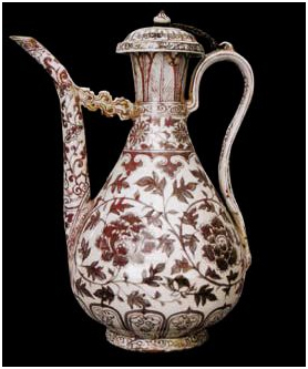 明洪武時(shí)期(公元1386年--1398年)贈(zèng)送的釉里紅牡丹紋執(zhí)壺,高37cm,足徑11cm,這是一件造型端莊美觀大方、繪工精細(xì)、十分鮮見(jiàn)的瓷器。由于釉里紅瓷器燒制難度大,成品率低,在現(xiàn)今中國(guó)內(nèi)地保存數(shù)量已很少,而在西藏能完好保存這件瓷品長(zhǎng)達(dá)600多年,實(shí)屬難得。