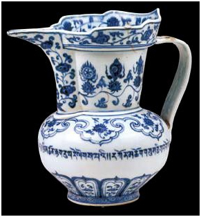 明宣德時(shí)期(公元1426年--1435年)贈(zèng)送的青花纏枝蓮紋僧帽壺,高23cm,底徑9cm。該壺是仿藏傳佛教僧人的僧帽所制,故稱“僧帽壺”。壺的通體飾青花紋樣,腹部書(shū)寫一圈藏文,意為“晝吉祥、夜吉祥、正午吉祥、晝夜吉祥、三寶吉祥”。但這圈銘文中的藏文字母和分隔符號(hào)書(shū)寫有誤,可見(jiàn)這是不通藏文的漢族工匠仿書(shū)。足墻飾美麗的卷草紋,器底青花雙圈書(shū)寫兩行六字“大明宣德年制”。宣德青花瓷以其古樸典雅的造型,晶瑩艷麗的釉色,多姿多彩的紋飾聞名于世。宣德時(shí)期西藏與內(nèi)地往來(lái)綿密,大量的青花瓷做為皇帝贈(zèng)品傳入西藏。西藏上層為保存這些瓷器不致受損,還用金屬或皮革制成瓷套盛裝。此件瓷壺從造型到紋飾,多含西藏元素,顯然它是朝廷命景德鎮(zhèn)官窯專門燒制贈(zèng)予西藏上層的。
