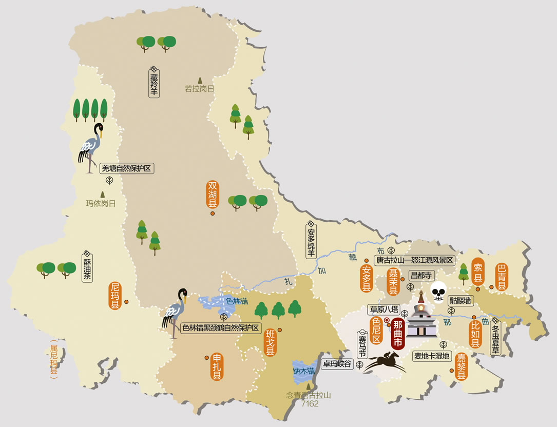 尼瑪縣 面積72530平方千米,人口33006,政府駐尼瑪鎮(zhèn),下轄1個(gè)鎮(zhèn)、13個(gè)鄉(xiāng)