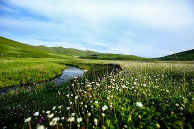 草甸、鮮花、小溪、藍(lán)天、白云、羊群,構(gòu)成了一幅優(yōu)美迷人的圖畫(huà)。