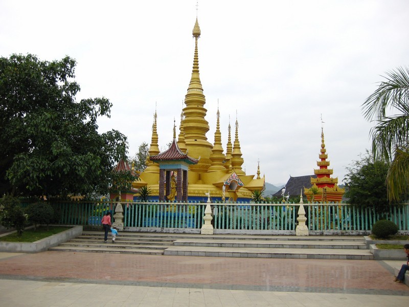 孟連金塔位于南壘河畔,建成于1997年,由8個小塔環(huán)抱一個主塔構(gòu)成,主塔高31.68米。