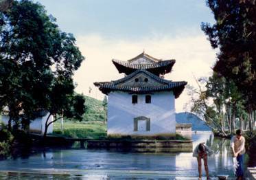 九苞鳳城,是指市區(qū)及城北的舞鳳山,土色粉紅,形同九頭丹鳳凌空翱翔。山溝梁王山的中支逼迫而來,如鳳首覽輝,左右兩山其勢如同鳳凰展翅。澂江古城,城墻高一丈九尺,方圓五華里零三分,門樓巍峨,南北的大街如書軸,東西的房屋相連,如打開的書卷,故有丹鳳銜書之稱。