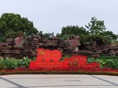 是為紀念中國共產(chǎn)黨第一次全國代表大會在南湖閉幕而建造的一座革命紀念館。作為中共“一大”會址重要場館和黨的誕生地,1959年根據(jù)有關(guān)部門的決定,經(jīng)中央審查同意,嘉興市籌建南湖革命紀念館,不僅仿制了南湖畫舫,還在湖心島建立了南湖革命紀念館,紅船停靠的湖心小島成為最初的館舍,于煙雨樓大廳中開辟中共“一大”史料陳列。1991年7月,為慶祝中國共產(chǎn)黨成立70周年,紀念館移建南湖北岸,由鄧小平同志題寫?zhàn)^名,建設(shè)資金主要由黨員自愿捐獻。建成的紀念館由鐮刀、錘子形組成的紀念性建筑物,占地面積3800平方米,建筑面積1980平方米。紀念館坐北朝南,廣場上有高大威嚴的宣誓臺和大型石雕照壁以及四個火炬型花壇。在鮮花擁簇下,紀念館顯得莊嚴雄偉。沿著臺階進入陳列大廳,正面是一艘南湖紅船模型和“中國共產(chǎn)黨第一次全國代表大會史料陳列”,兩個展廳分別布置了《中國共產(chǎn)黨第一次代表大會史料陳列》、《黨和國家領(lǐng)導(dǎo)人對南湖的關(guān)懷》等陳列,其中包括江澤民、胡錦濤、朱镕基、楊尚昆、宋平、姚依林、彭真等中央領(lǐng)導(dǎo)同志前來參觀、考察的照片和江澤民、李鵬、陳云、李先念等同志為紀念館的題詞。南湖革命紀念館是中國百個愛國主義教育基地之一,每年有近百萬的游人前來參觀瞻仰。