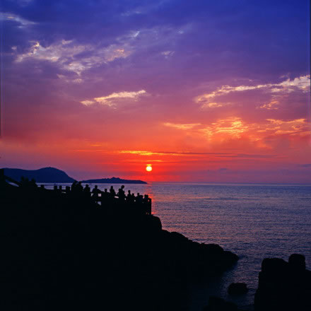 南麂島有兩座山,一座叫南麂山,高192米,另一座叫大山,高229米。這兩山蟠踞在一起,東南面形成了大沙岙,西北面形成了馬祖岙,站在山巔可望東海萬頃云濤。尤其是看日出,一輪紅日,躍出在海平線上;紅日西沉,則滿天彩霞,逐步消失于蒼茫的暮色之中。