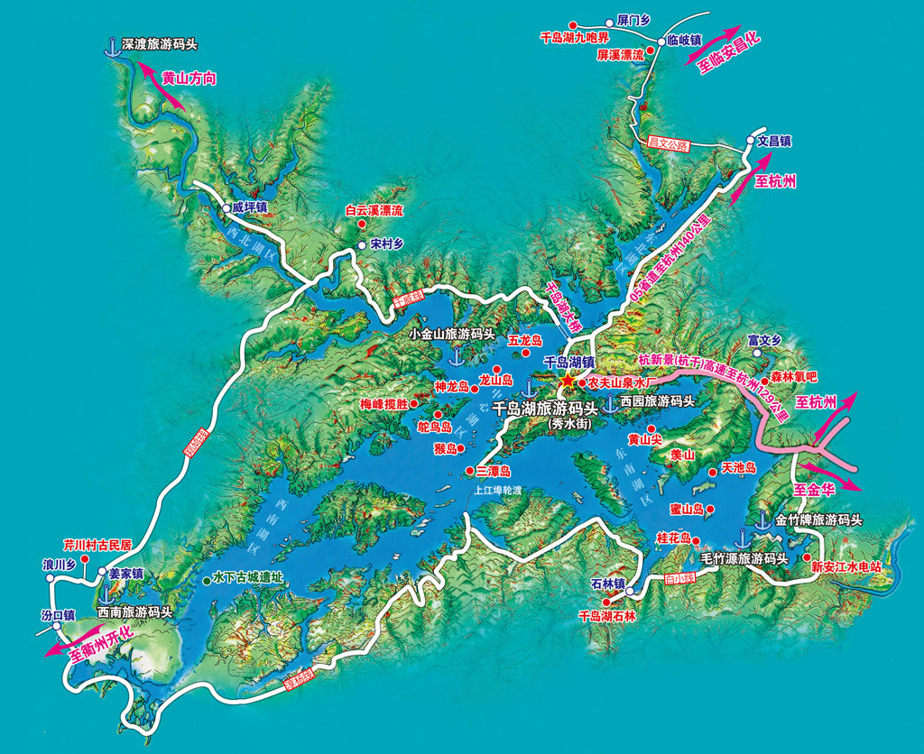 千島湖與桐廬瑤林仙境、嚴(yán)子陵釣臺,建德大慈巖,蘭溪諸葛八卦村,龍游石窟,安徽西遞、宏村等景點聯(lián)成一體,體,吸引眾多的游客。千島湖所在的淳安縣北接臨安縣、南接常山縣、西南與開化縣、衢州市為鄰,東南與桐廬和建德二縣市接壤,西北與安徽省交界。